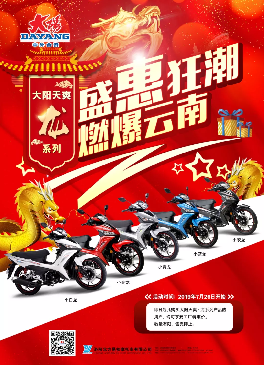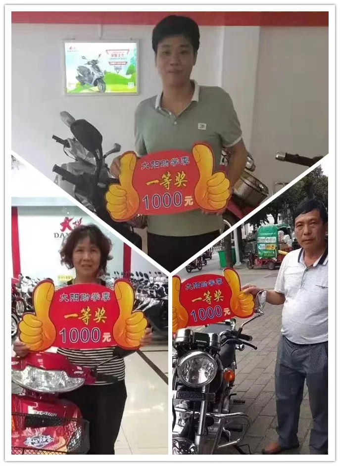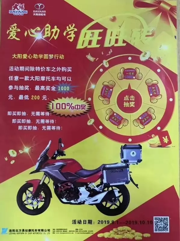 活动期间购买任意一款大阳摩托车(特价车除外)均可参与抽奖,最高奖金1000元,100%中奖!另外还有特价车、以旧换新、0首付购车等活动同步开展。